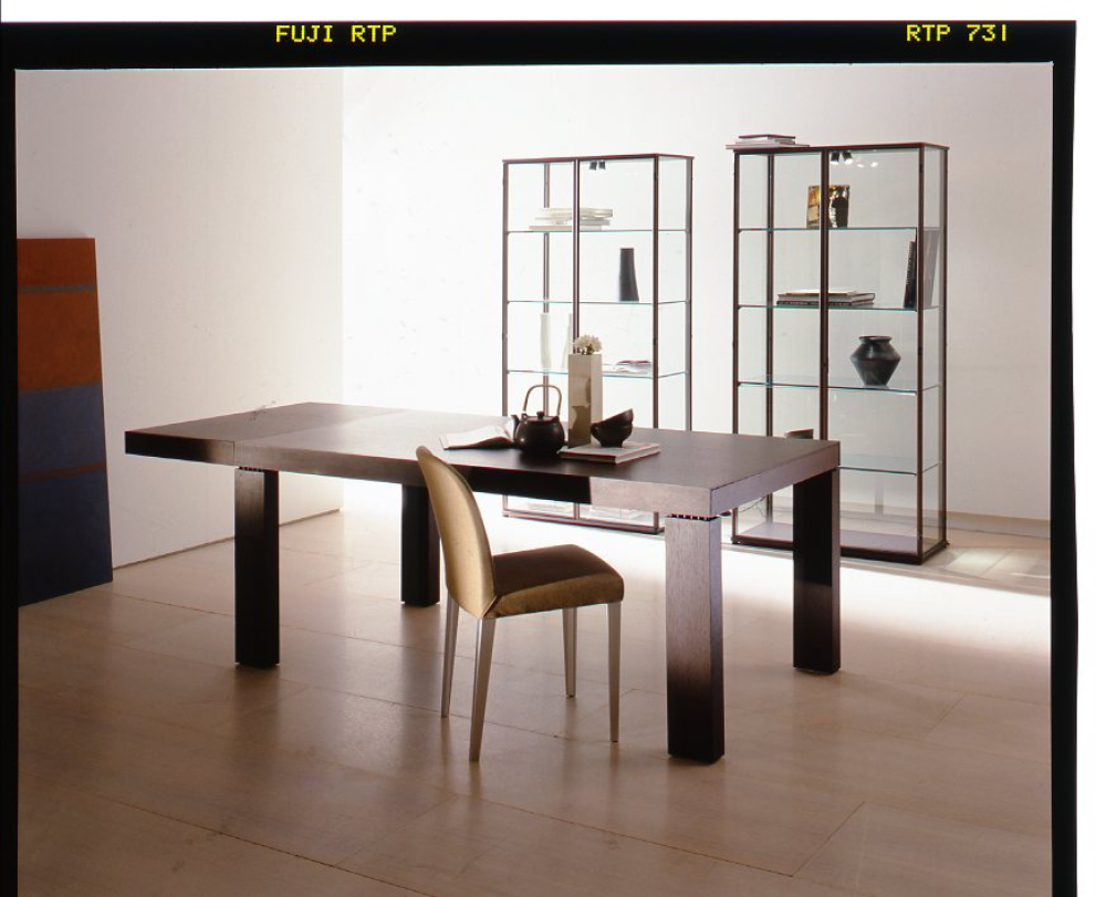Base e top in legno a cui vengono avvitati i montanti. Piani in vetro all’interno per mostrare preziosi contenuti. Con Mita Molteni&C introduce l’impiallacciatura su metallo che diverrà una delle caratteristiche peculiari della sua produzione fino ai giorni nostri.
